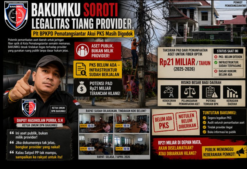 PEMATANGSIANTAR — Polemik pemanfaatan aset daerah untuk jaringan fiber optik di Kota Pematangsiantar semakin memanas. Dewan Pimpinan Nasional Lembaga Hukum dan Lingkungan (DPN BAKUMKU) mendesak pemerintah kota untuk segera mengambil tindakan tegas terhadap para penyedia jasa telekomunikasi yang menggunakan ruang publik tanpa dasar hukum yang jelas.