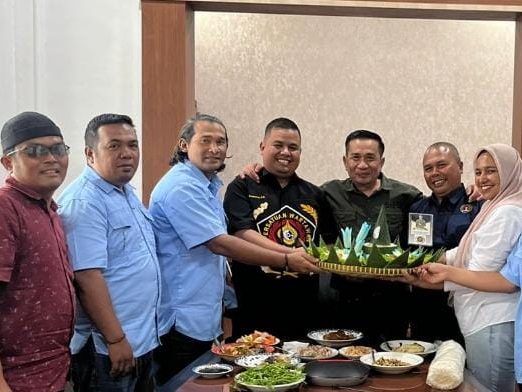 Ketua PWI Kota Tanjungbalai, Saufi Simangunsong, S.H, bersama jajaran pengurus secara langsung menyerahkan nasi tumpeng nasi kuning khas Melayu Tanjungbalai sebagai simbol kebersamaan dan penghormatan.